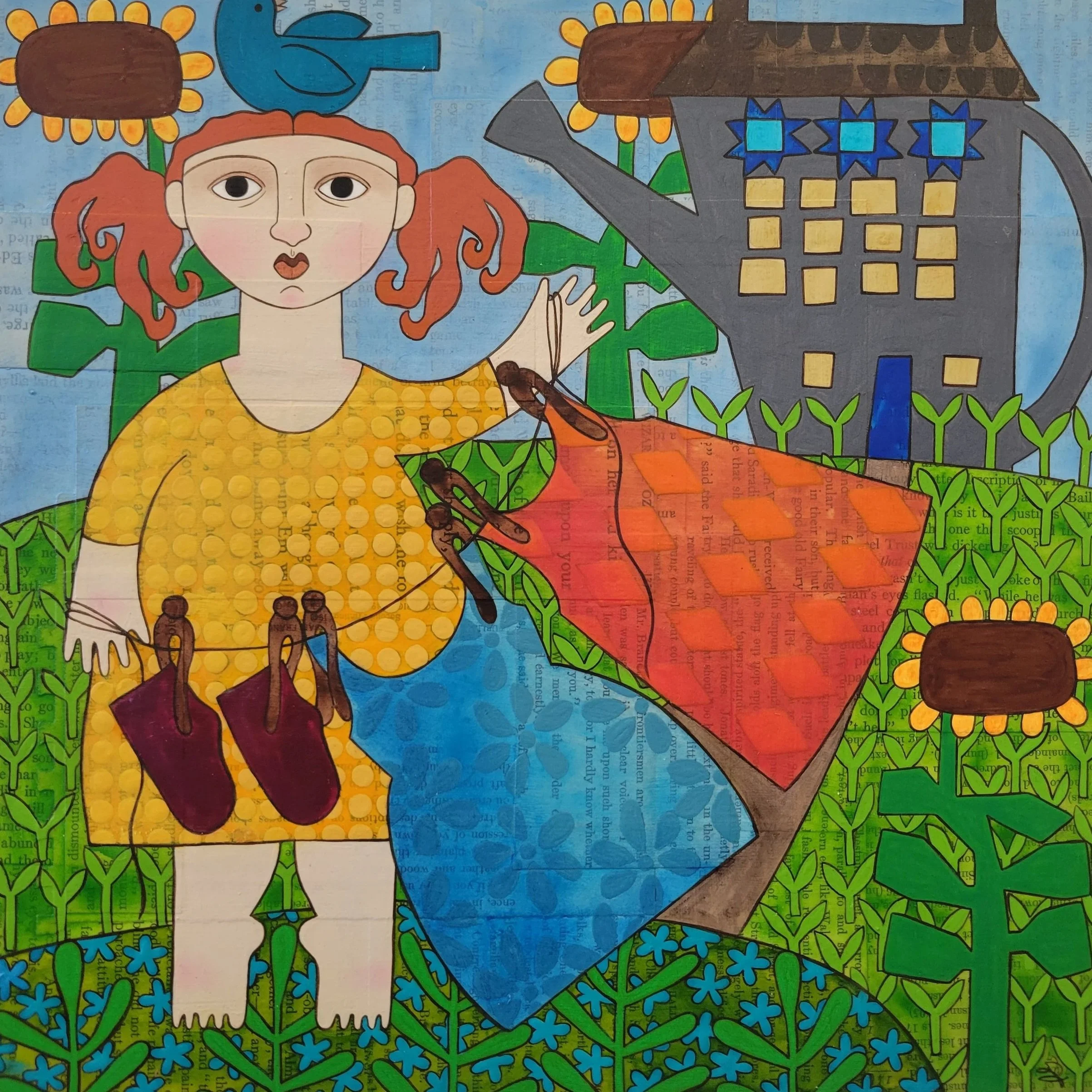 Irene is a self-taught contemporary folk artist. She creates mixed media art using old and new papers, fabric, acrylics, ink, to name a few.